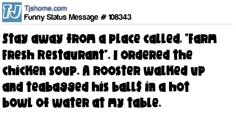 X Stay away from a place called, "Farm Fresh Restaurant". I ordered the chicken soup. A rooster walked up and teabagged his ball$ in a hot bowl of water at my table.