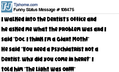 X is I walked into the Dentist's office and he asked me what the problem was and I said ''Doc, I think I'm a Giant Moth!'' He said ''You need a Psychiatrist not a Dentist, why did you come in here?'' I told him ''The light was on!!!''