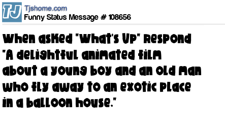 X says When asked "What's Up" respond "A delightful animated film about a young boy and an old man who fly away to an exotic place in a balloon house."