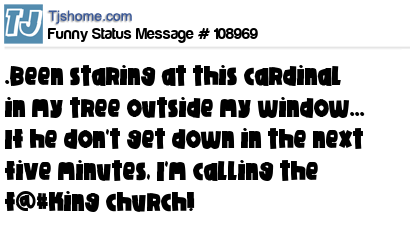 X says .Been staring at this cardinal in my tree outside my window... If he don't get down in the next five minutes, I'm calling the f@#king church!