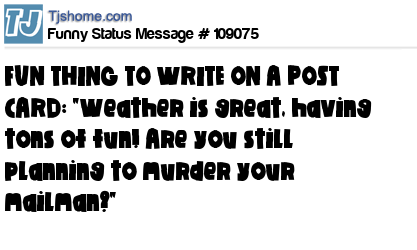 - # 148074 FUN THING TO WRITE ON A POST CARD: “Weather is great, having tons of fun! Are you still planning to murder your mailman?”