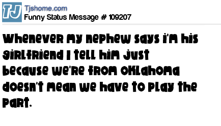 X says whenever my nephew says i'm his girlfriend I tell him just because we're from oklahoma doesn't mean we have to play the part.