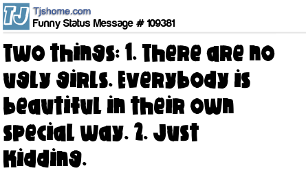 X says Two things: 1. There are no ugly girls. Everybody is beautiful in their own special way. 2. Just kidding.