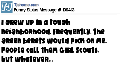 X I grew up in a tough neighborhood. Frequently, the green berets would pick on me. People call them Girl Scouts, but whatever...
