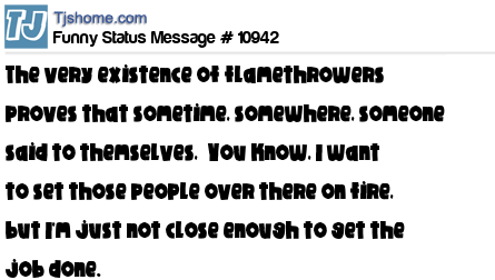 - # 100908 The very existence of flamethrowers proves that sometime, somewhere, someone said to themselves,"You know, I want to set those people over there on fire, but I'm just not close enough to get the job done."