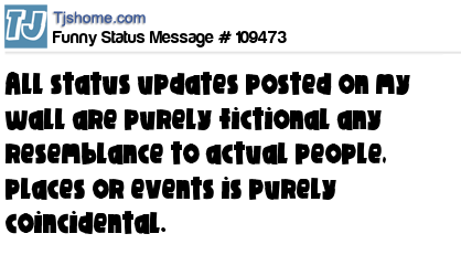 X All status updates posted on my wall are purely fictional any resemblance to actual people, places or events is purely coincidental.