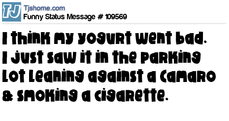 X  I think my yogurt went bad. I just saw it in the parking lot leaning against a Camaro & smoking a cigarette.
