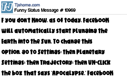 - # 57776 WARNING! As of Friday, Facebook will automatically start dragging the Earth into the Sun. To change this option, go to Settings > Planetary Settings > Trajectory, then UNCLICK the box that says "Apocalypse." Facebook kept this one quiet. Copy and pa