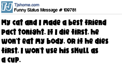 X says My cat and I made a best friend pact tonight. If I die first, he won't eat my body. Or if he dies first, I won't use his skull as a cup.