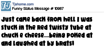 X is Just came back from hell I was stuck in the red twisty tube at chuck e cheese....being poked at and laughed at by brats!