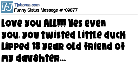 X Love you ALL!!! Yes even you, you twisted little duck lipped 18 year old friend of my daughter...