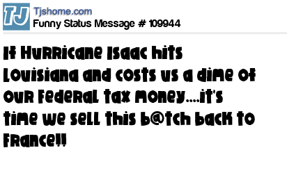 X is If Hurricane Isaac hits Louisiana and costs us a dime of our Federal tax money....it's time we sell this b@tch back to France!!