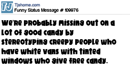X is We're probably missing out on a lot of good candy by stereotyping creepy people who have white vans with tinted windows who give free candy.