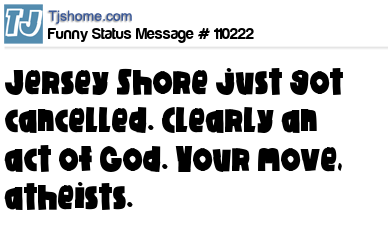 X is Jersey Shore just got cancelled. Clearly an act of God. Your move, atheists.