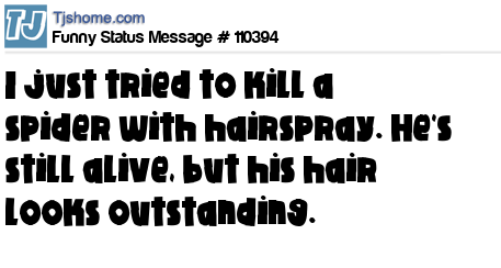 - # 201209 Last week, I tried to kill a spider with an entire can of cheap hairspray. No luck. It now smokes two packs a day, wears blue eye shadow, joined a bowling league and calls itself "Brenda."