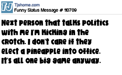 X says Next person that talks politics with me I'm kicking in the crotch. I don't care if they elect a pineapple into office. It's all one big game anyway.