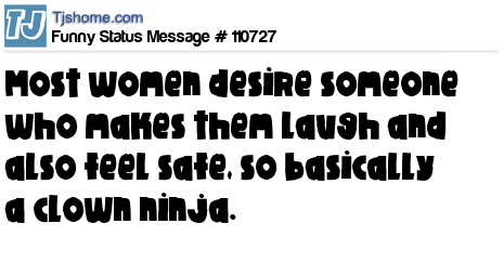 - # 207006 Women desire someone who makes them laugh and also feel safe. So basically, a clown ninja.