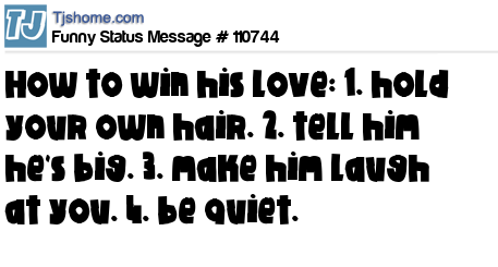 X says How to win his love: 1. hold your own hair. 2. tell him he's big. 3. make him laugh at you. 4. be quiet.