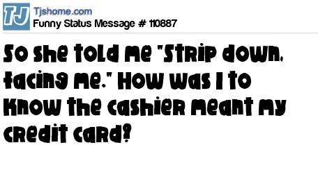 - # 183459 had a mix up at the store today when the cashier asked me to strip down facing her she apparently was talking about my debit card..