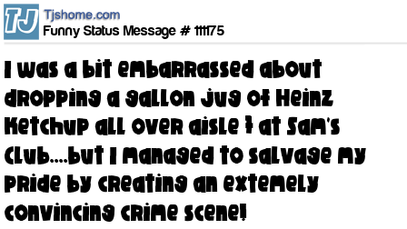 X I was a bit embarrassed about dropping a gallon jug of Heinz ketchup all over aisle 7 at Sam's Club....but I managed to salvage my pride by creating an extemely convincing crime scene!