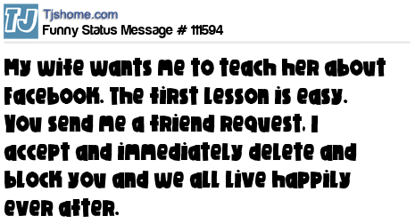 X says My wife wants me to teach her about Facebook. The first lesson is easy. You send me a friend request, I accept and immediately delete and block you and we all live happily ever after.