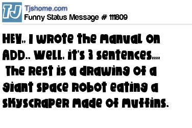- # 189019 HEY, I wrote the manual on ADD…. Well, it's not actually a manual. It's only 3 sentences…. The rest is a drawing of a giant space robot eating a skyscraper made of muffins.