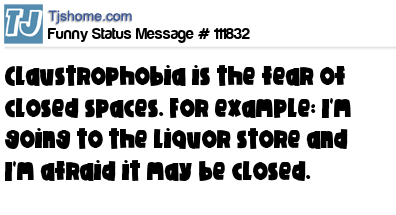 X says Claustrophobia is the fear of closed spaces. For example: I'm going to the liquor store and I'm afraid it may be closed.