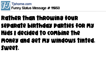 X is Rather than throwing four separate birthday parties for my kids I decided to combine the money and get my windows tinted. Sweet.