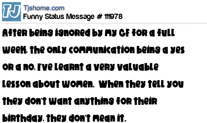 X After being ignored by my GF for a full week, the only communication being a yes or a no, I've learnt a very valuable lesson about women. When they tell you they don't want anything for their birthday, they don't mean it.
