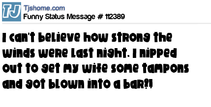 - # 112493 I can't believe how strong the winds were last night. I went out to get my GF some milk and got blown into the f*cking bar.