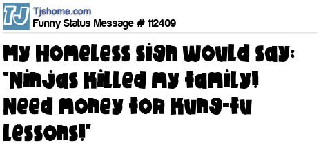 X My Homeless sign would say: "Ninjas killed my family! Need money for kung-fu lessons!"