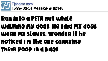 X says Ran into a PETA nut while walking my dogs. He said my dogs were my slaves. Wonder if he noticed I'm the one carrying their poop in a bag?