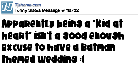 X says Apparently being a "Kid at heart" isn't a good enough excuse to have a Batman themed wedding :(