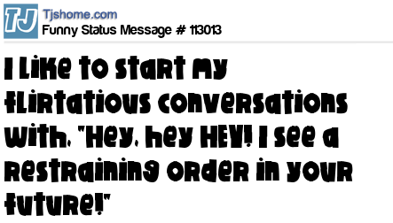 X says I like to start my flirtatious conversations with, "Hey, hey HEY! I see a restraining order in your future!"