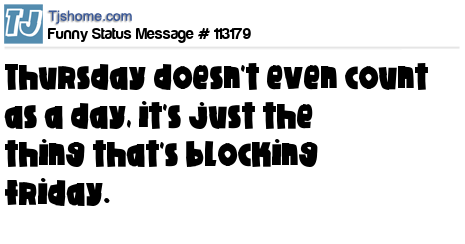 - # 12150 Someone came up to me and said "T.G.I.F. Thank god its Friday!" I replied "S.H.I.T. Sorry hun,it's Thursday."