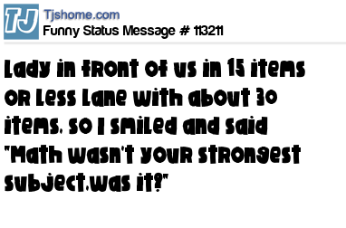X says Lady in front of us in 15 items or less lane with about 30 items, so I smiled and said "Math wasn't your strongest subject,was it?"