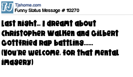 X Last night,,, I dreamt about Christopher Walken and Gilbert Gottfried rap battling...... (You're welcome, for that mental imagery)