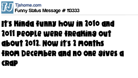 X is It's kinda funny how in 2010 and 2011 people were freaking out about 2012. Now it's 2 months from December and no one gives a crap