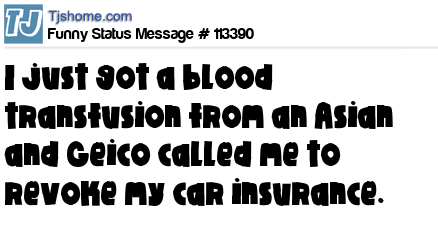 X says I just got a blood transfusion from an Asian and Geico called me to revoke my car insurance.
