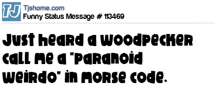 - # 109923 I just heard a woodpecker call me a 'paranoid old weirdo' in morse code.