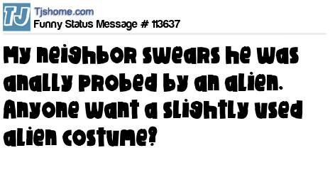 - # 187838 LOL! My neighbor swears she was anally probed by an alien last night...... BTW, Anyone want a slightly used alien costume?