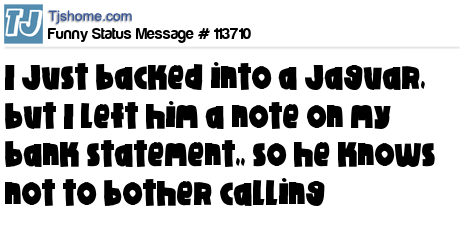- # 100823 Just backed into a Jaguar but I left him a note on my bank statement so he knows not to bother calling