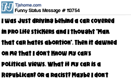X says I was just driving behind a car covered in pro life stickers and I thought "Man, that car hates abortion". Then it dawned on me that I don't know my car's political views. What if my car is a Republican? Or a racist? Maybe I don't want to know. I like my