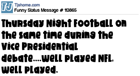 X Thursday Night Football on the same time during the Vice Presidential debate....well played NFL, well played.