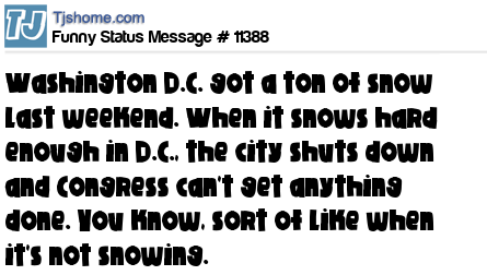 X Washington D.C. got a ton of snow last weekend. When it snows hard enough in D.C., the city shuts down and Congress can't get anything done. You know, sort of like when it's not snowing.