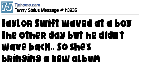 - # 135890 Taylor Swift just waved at a boy and he didn't wave back so now she's got a new album coming out tomorrow.