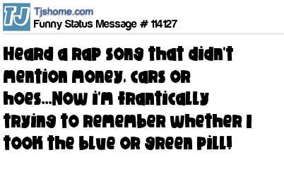 X says Heard a rap song that didn't mention money, cars or hoes...Now i'm frantically trying to remember whether I took the blue or green pill!