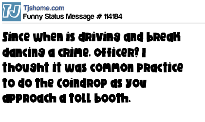 X says Since when is driving and break dancing a crime, officer? I thought it was common practice to do the Coindrop as you approach a toll booth.