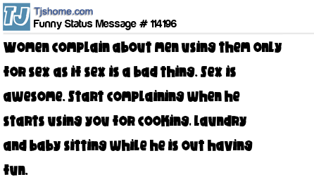 X says Women complain about men using them only for sex as if sex is a bad thing. Sex is awesome. Start complaining when he starts using you for cooking, laundry and baby sitting while he is out having fun.