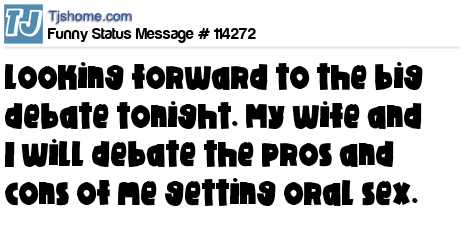 X is looking forward to the big debate tonight. My wife and I will debate the pros and cons of me getting oral sex.